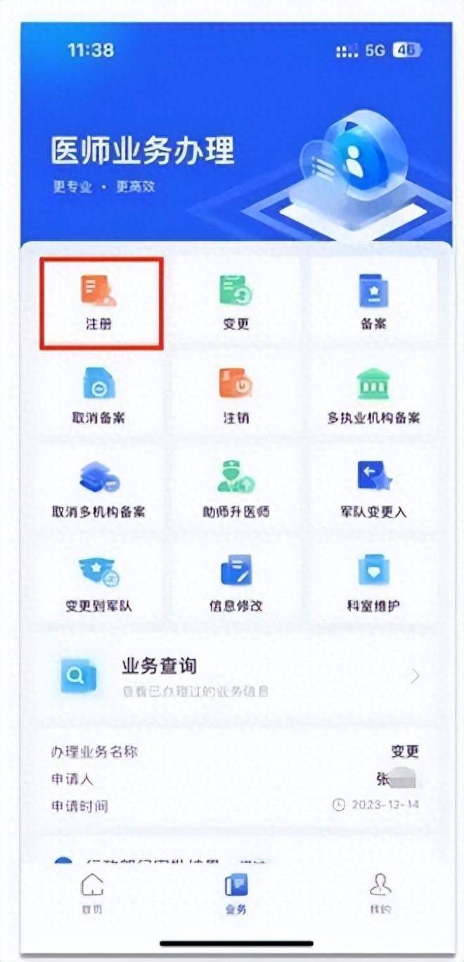 1、在底部中间选项卡选择“业务”,进入界面后,点击【注册】。