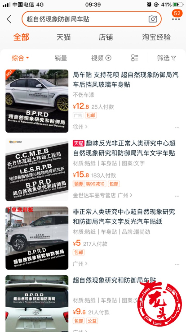 记者上网查阅到,徐州、长沙、北京的街头,都出现过带有"超自然现象研究和防御局"字样的个性车贴。记者随后登录淘宝网发现,有不少商家出售"超自然现象研究和防御局"车贴,其中月销量最高的一家达到400多单。