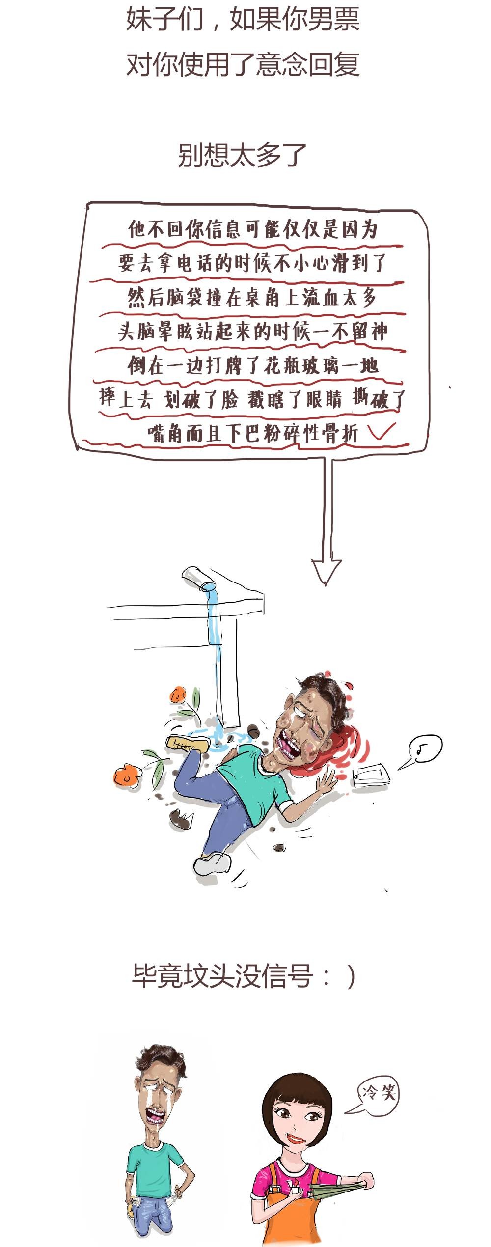 他不回你信息可能仅仅是因为要去拿电话的时候不小心滑到了然后脑袋撞在桌角上流血太多头脑晕眩站起来的时候一不留神倒在一边打牌了花瓶玻璃一地摔上去 划破了脸 戳瞎了眼睛 撕破了嘴角而且下巴粉碎性骨折。