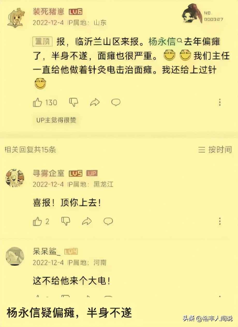 他表示,杨永信在2021年的时候就已经半身不遂(俗称偏瘫),而且面瘫也非常严重。之所以知道这些消息,只因为他的主任一直给他做针灸电击治疗面瘫,自己还曾给他上过针。