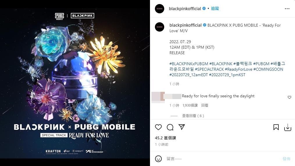 回归消息曝光后,粉丝也苦等进一步消息,不过眼见同样宣布回归的少女时代和TWICE宣传动作频频,BLACKPINK这边却一直没有后续,总算在今日稍早,官方释出最新一波宣传,没想到竟然是代言合作的线上游戏公司PUBG MOBILE,将在7月29日推出〈Ready For Love〉MV的消息。