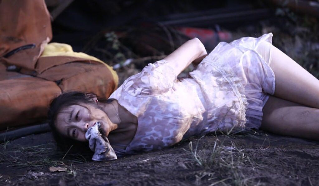 片中的关晓彤穿着短裤,就这样被连拖带拽的,两条腿都磨破了,嘴里还含着全是粉末的脏毛巾,但关晓彤只能强制自己坚持。