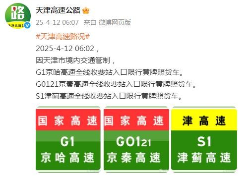 另据@天津高速公路 消息,截至12日06:02,因天津市境内交通管制,G1京哈高速全线收费站入口限行黄牌照货车。G0121京秦高速全线收费站入口限行黄牌照货车。S1津蓟高速全线收费站入口限行黄牌照货车。