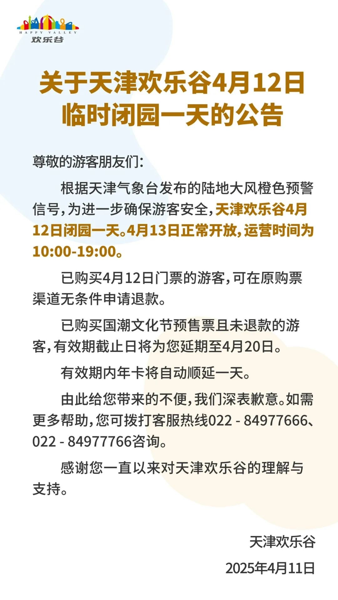 11日晚,“天津欢乐谷”微信公众号发布公告,天津欢乐谷4月12日临时闭园一天。