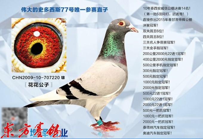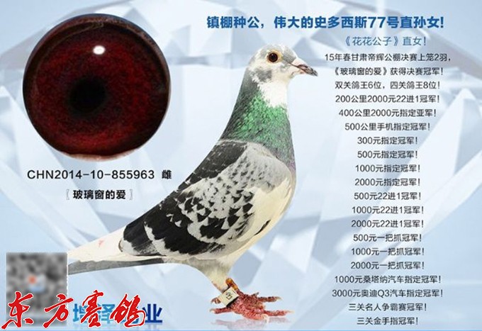 15年春甘肃帝辉公棚决赛上笼2羽,获得决赛冠军!双关鸽王6位,四关鸽王8位!通指获17项指定冠军!200公里2K组22进1冠军,400公里2K指定亚军,500公里手机指定冠军,300元指定冠军,500元指定冠军,1000元指定冠军、2000元指定冠军,500元22进1冠军,1000元22进1冠军,2000元22进1冠军,500元一把抓冠军,1000元一把抓冠军,2000元一把抓冠军,1000元桑塔纳汽车指定冠军,3000元奥迪Q3汽车指定冠军,三关名人争霸赛冠军,三关金手指冠军