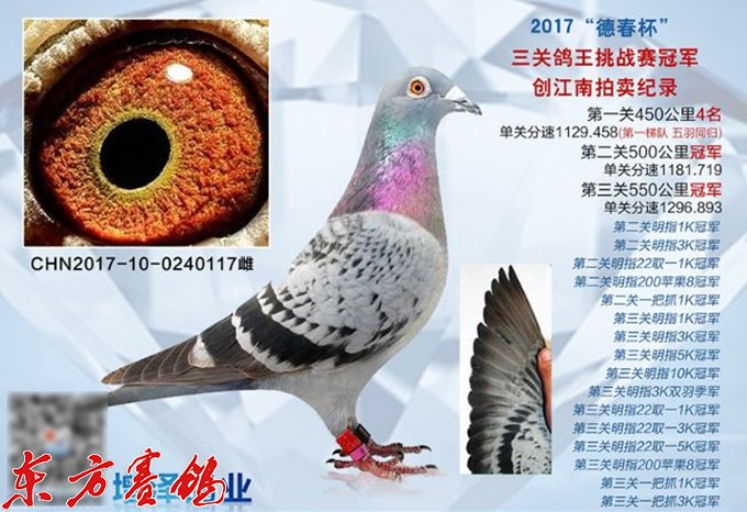 2017年江苏德春电力俱乐部三关鸽王挑战赛三关鸽王总冠军:第一关450公里4名,第二关500公里冠军,第三关550公里冠军!第二关:明指1K、3K冠军,22取一1K、3K冠军,200苹果8冠军。第三关:明指1K、3K、5K、10K季军,3K双羽季军,22取一1K、3K、5K冠军,200苹果8冠军,一把抓1K、3K冠军,本舍100万拍回!