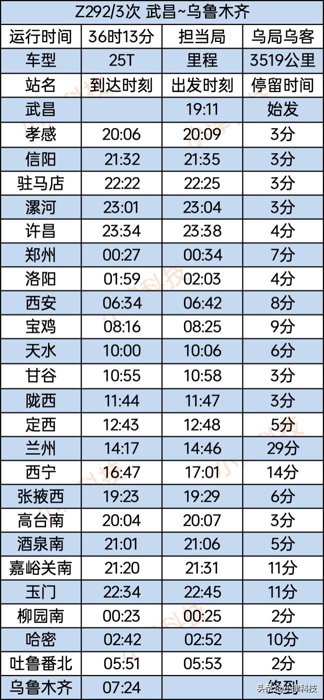 武昌站至乌鲁木齐站Z292/293次运行运行36小时13分,经停武昌、孝感、信阳、驻马店、漯河 许昌、郑州、洛阳、西安、宝鸡、天水、甘谷、陇西、定西、兰州、西宁、张掖西、高台南、酒泉南、嘉峪关南、玉门、柳园南、哈密、吐鲁番北、乌鲁木齐。