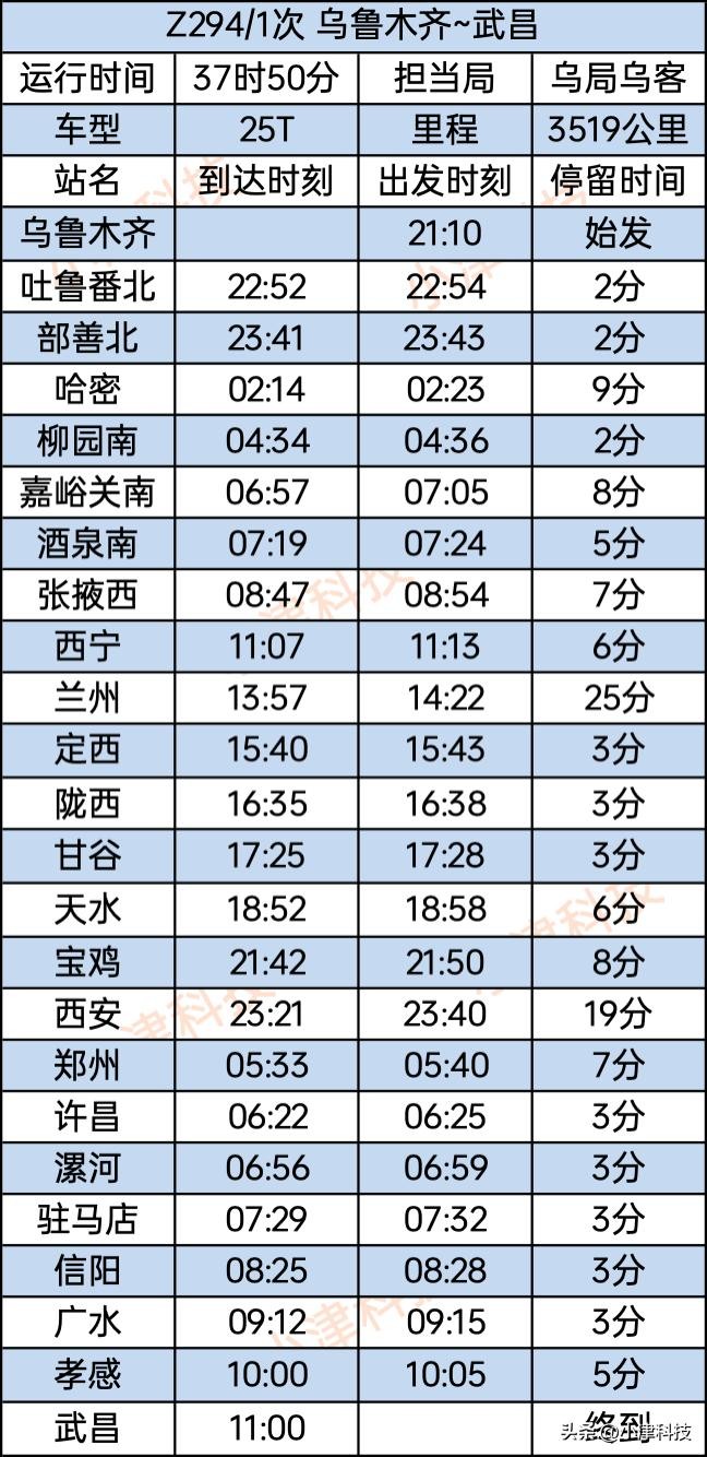 乌鲁木齐站至武昌站Z294/291次全程运行37小时50分,经停乌鲁木齐、吐鲁番北、部善北、哈密 柳园南、嘉峪关南、泉南、张掖西、西宁、兰州、定西、陇西、甘谷、天水、宝鸡、西安、郑州、许昌、漯河、驻马店、信阳、广水、孝感、武昌。