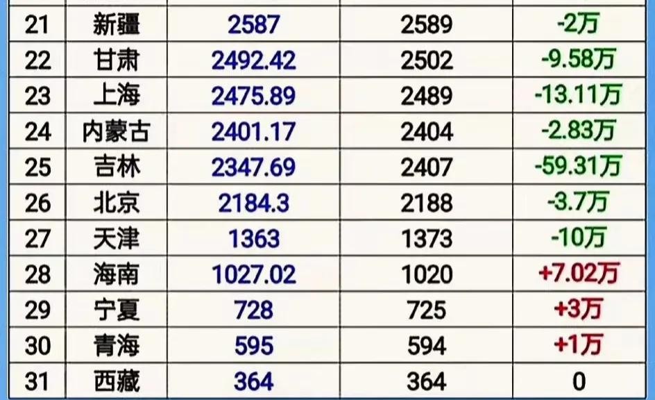 31个省市2023年常住人口较2022年相比较,有16个省市人口处于流入,西藏持平,有14个省市人口处于流出,令我感到意外的是北京和上海,2023年常住人口也都是处于流出的状态。