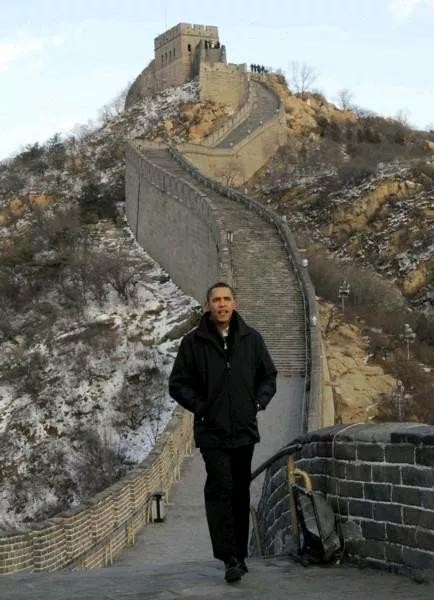 一袭黑衣的奥巴马在登上长城后,感慨万千:“长城太雄伟了,让我想起了悠久的中国历史!”离开长城时,他意犹未尽,说很高兴能够来到长城,只是今天游览的时间有些短,希望以后还有机会。