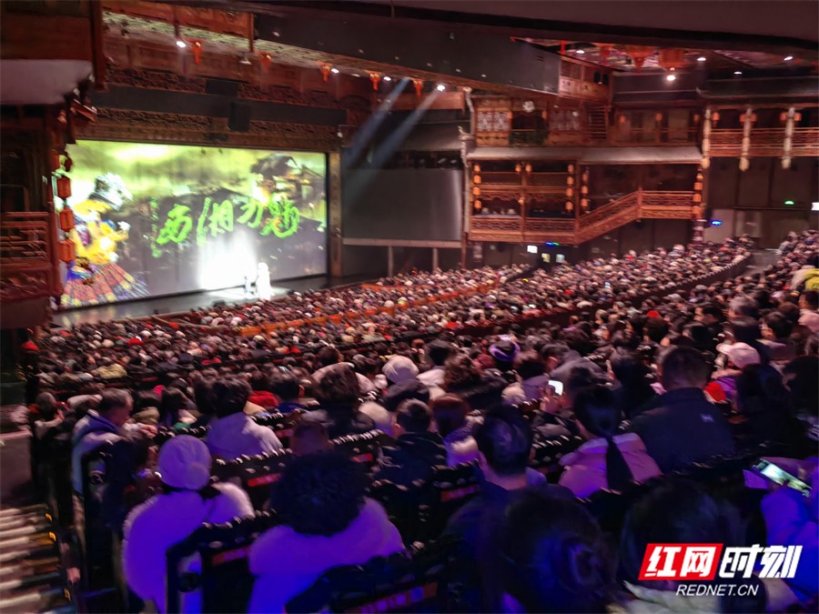 1月29日晚7时许,张家界魅力湘西大剧院灯火辉煌,三千个座位座无虚席,来自五湖四海的游客齐聚一堂,共同领略蛇年春节首场极具湘西特色的民俗文化节目。