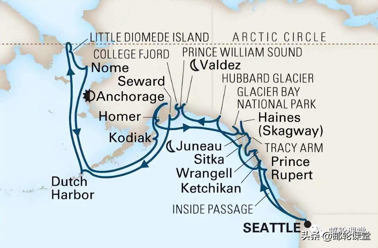 阿拉斯加的其他站点包括史凯威、荷马、朱诺、凯奇坎、西沃德、锡特卡、瓦尔迪兹和兰格尔。 此次航行还将访问加拿大的鲁珀特王子港。
