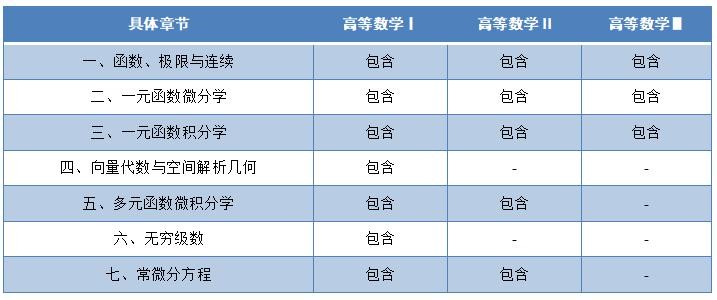 2)高等数学(分为高等数学Ⅰ、高等数学Ⅱ、高等数学Ⅲ)最大的差别便是考纲内容不同,具体内容如下:
