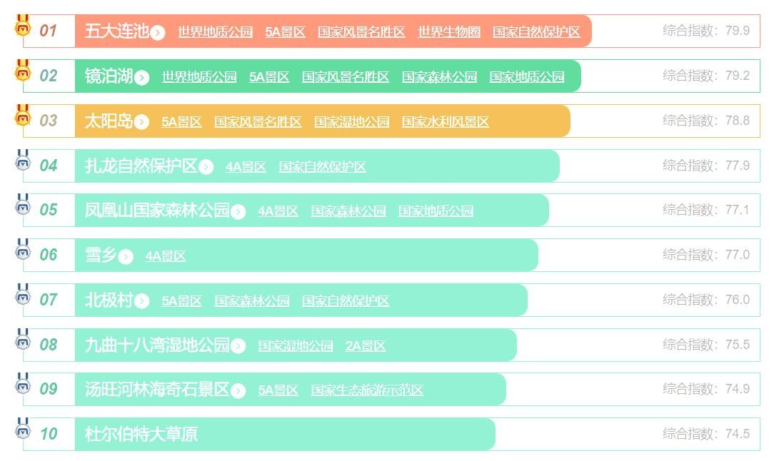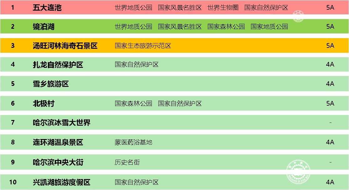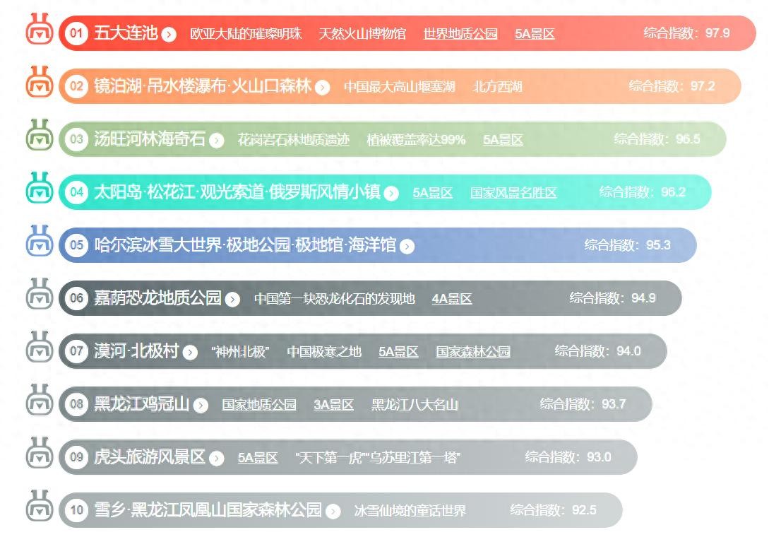 黑龙江最值得去的十大景点排名第一的还是五大连池景区,位列第二的还是镜泊湖景区,位列第三的是漠河的北极村。