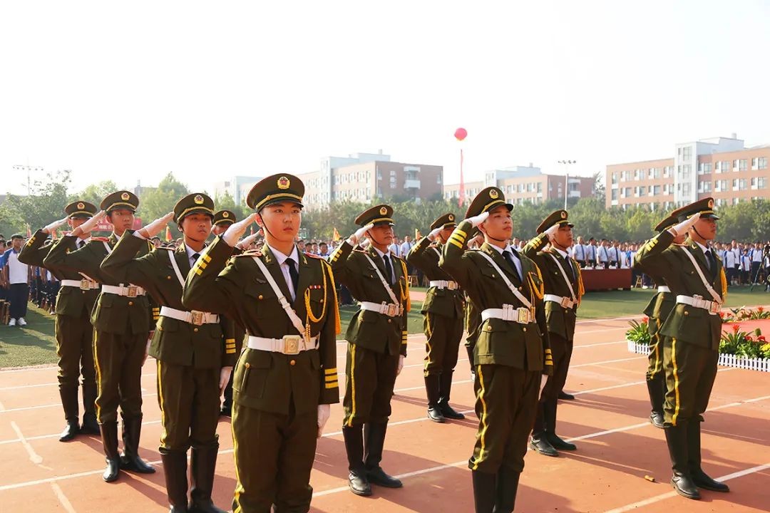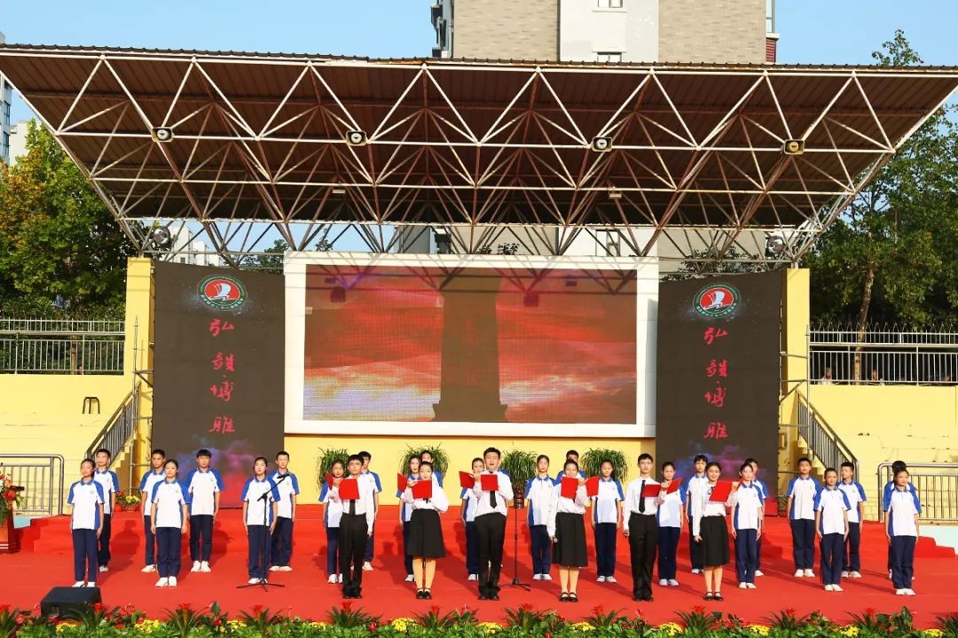 庄严的升旗仪式中,国旗护卫队身姿挺拔,用庄重严肃的步伐护送国旗入场,管乐团意气风发,用双手弹奏着对祖国的伟大敬意。全体师生目视国旗,洪亮的国歌声响彻校园。