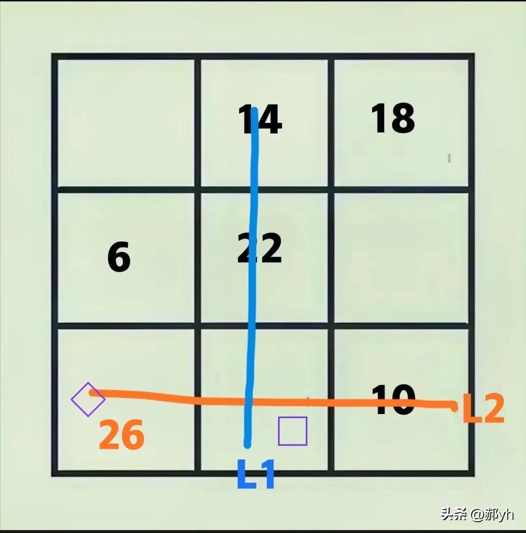 2、全体宫格数之和,如图三。等于L1、L2、L3之和。即3倍的幻和