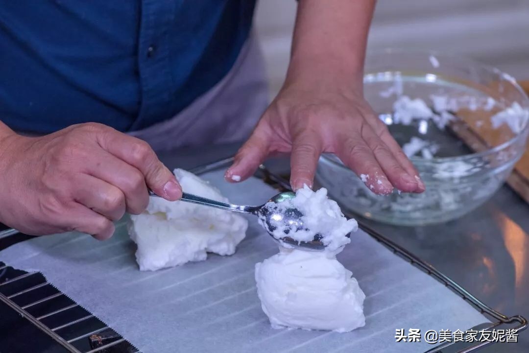 将烘焙纸铺在烤架上,将打发后的蛋白舀出放在烘焙纸上。