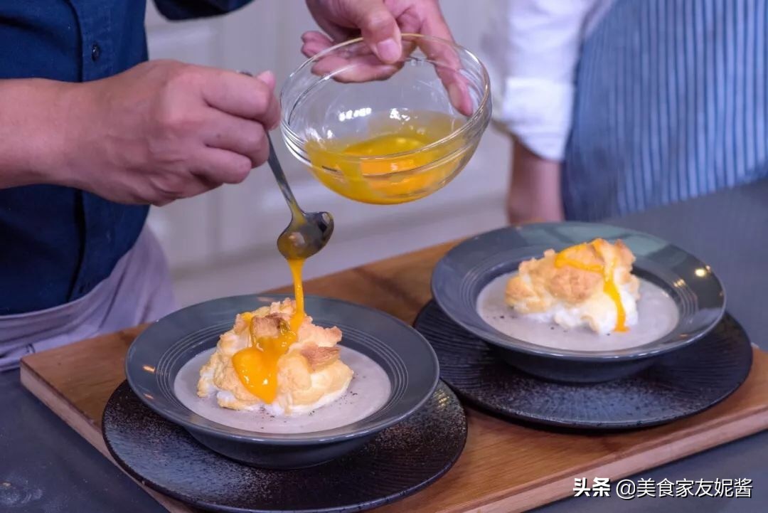 将加热后的奶油蘑菇汤倒入成品盘中,撒上黑胡椒,放上烤好的蛋白并在上面淋上蛋黄液、松露油,即可享用美味。