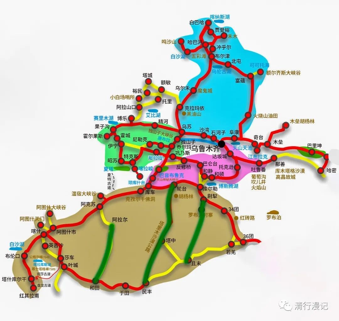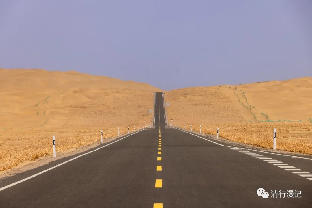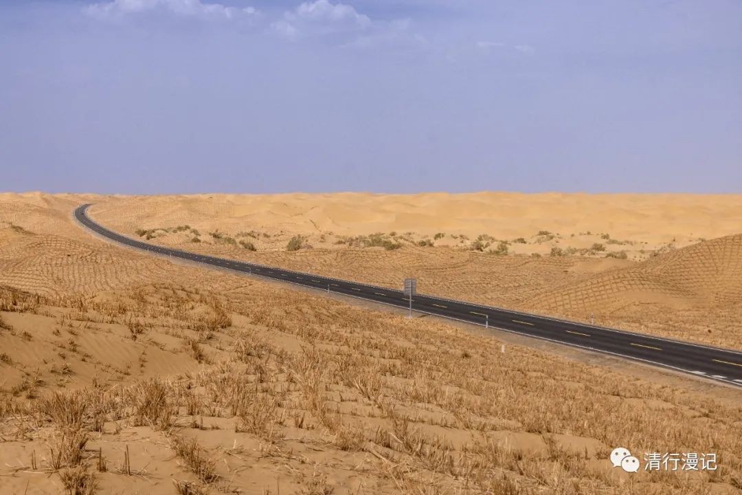 告别了罗布人村寨,我们直接上了尉犁至且末的沙漠公路。提到塔克拉玛干沙漠公路,一般人都以为指的是轮台到民丰那条,其实穿过塔克拉玛干沙漠的公路现在有三条,第一条是轮台县到民丰县(国道216),全长566公里;第二条阿拉尔市到和田市(国道580),全长424公里;第三条尉犁县至且末县(省道254),全长333公里,一年前刚通车;地图上标出了三条绿线。