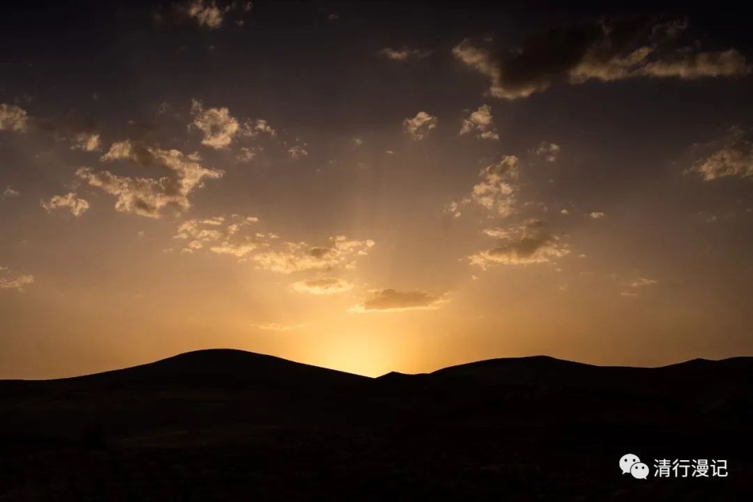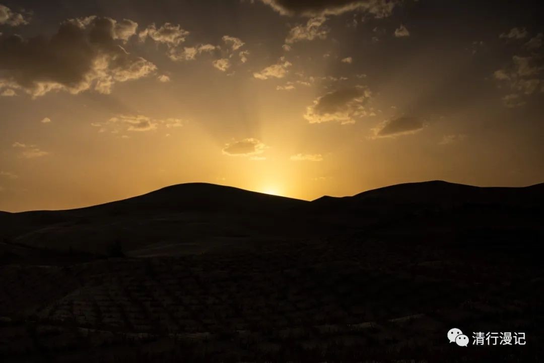 晚上9点多,沙漠落日缓缓来到,金黄色的夕阳光辉映照在天际,不知是否黄沙漫漫的缘故,居然没有红霞满天。