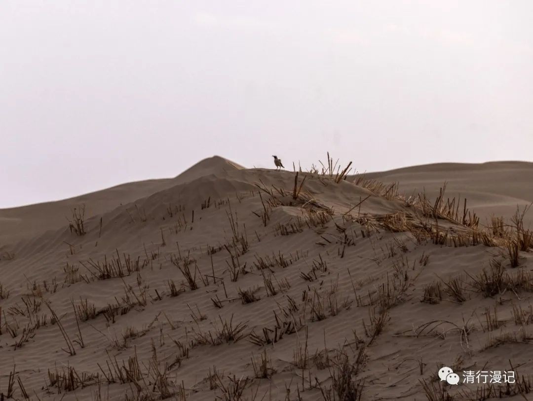 看上去不是黄色的沙丘,是光线暗淡的缘故。沙堆上居然看到一只鸟,真稀罕。