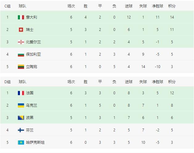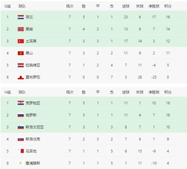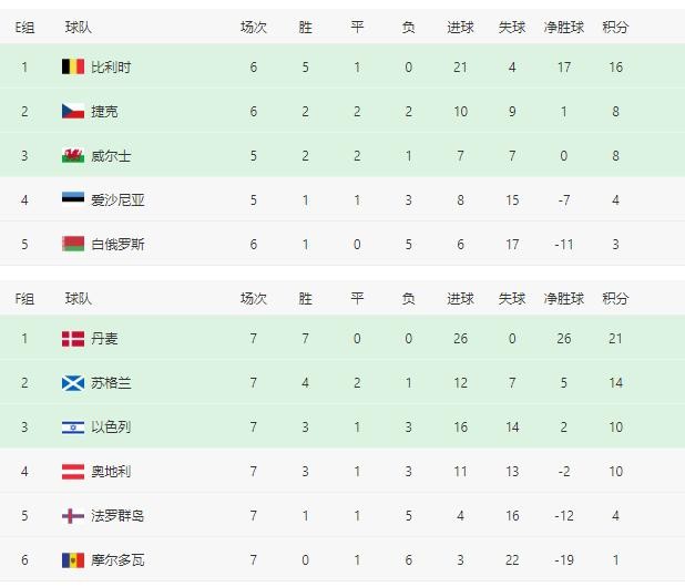 2022世界杯欧洲区预选赛暨12强赛实时积分表(10月11日)