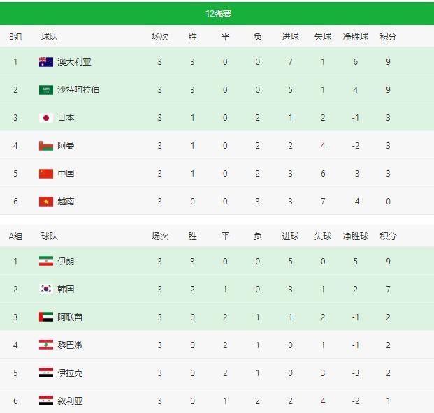 世界杯亚洲区预选赛(12强赛)小组积分