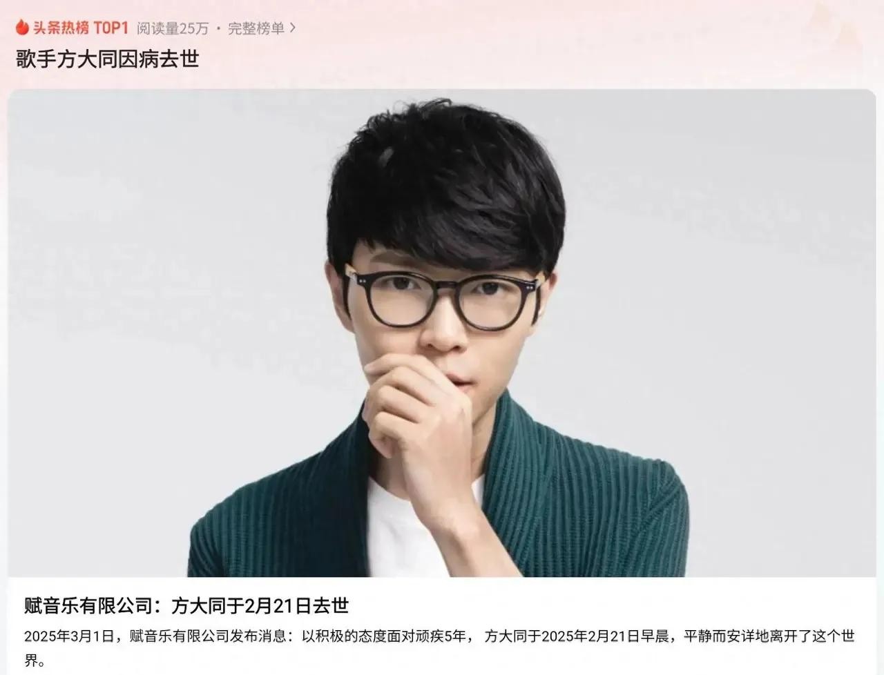 2025年2月21日的清晨,一则消息让无数乐迷心碎——音乐才子方大同,在41岁的盛年悄然离世。而就在去世前一周,他还在微博发布新歌《那沙漠里的水》,镜头前的他面容消瘦却眼神坚定,仿佛用最后的力气完成了一场与命运的浪漫对话。