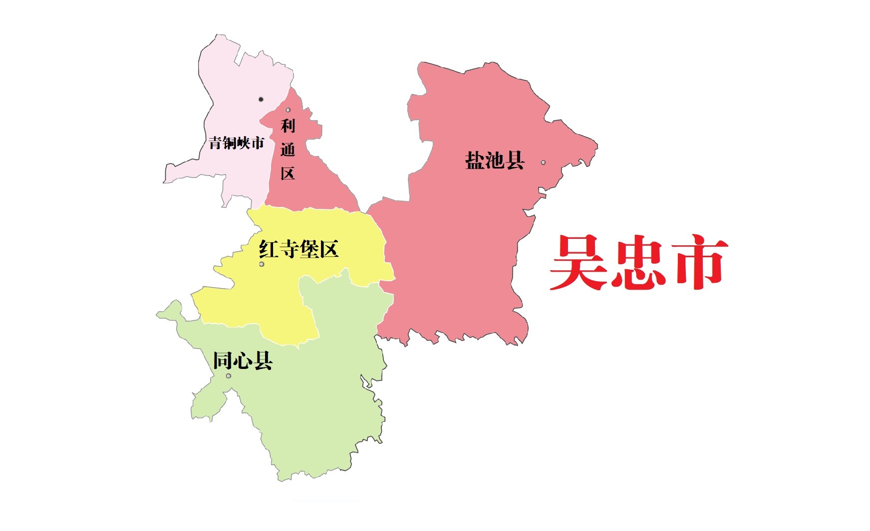 吴忠市,市政府驻利通区。位于宁夏回族自治区中部,东与内蒙古鄂尔多斯市、陕西榆林市、甘肃庆阳市毗邻,南与固原市接壤,西与中卫市和内蒙古的阿拉善盟为邻,北靠银川市。