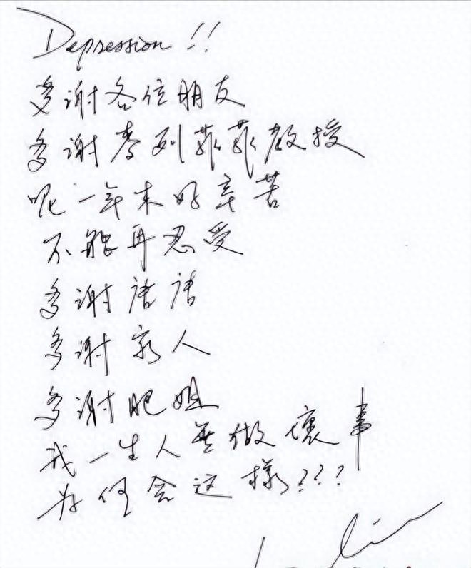 张国荣在他的遗嘱中曾写下“Depression(沮丧、抑郁)。多谢各位朋友,多谢麦列菲菲教授。呢一年来很辛苦,不能再忍受,多谢唐先生,多谢家人,多谢肥姐。我一生没做坏事,为何这样?”下款署名:Leslie。