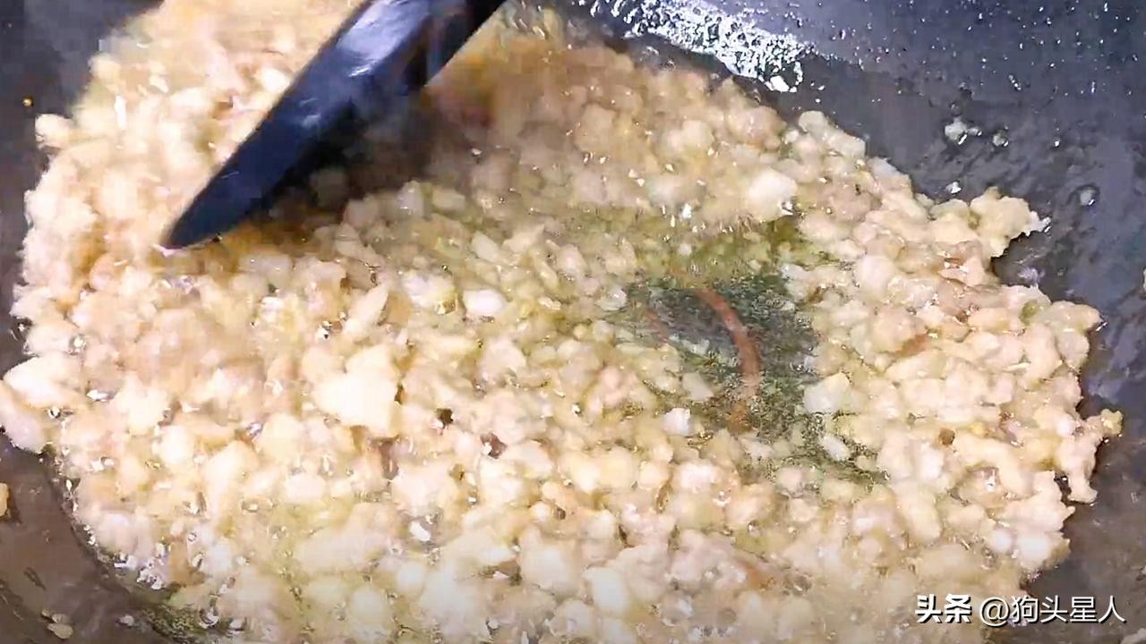 5.起锅倒油,下入猪肉末煸炒,炒至变色,炒出油脂。