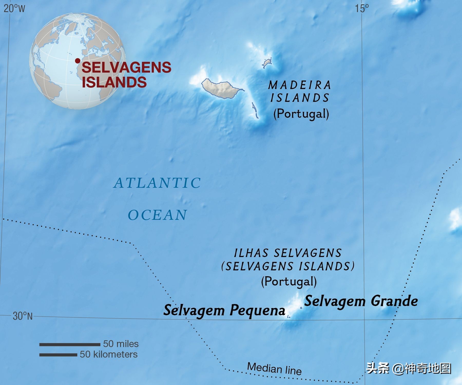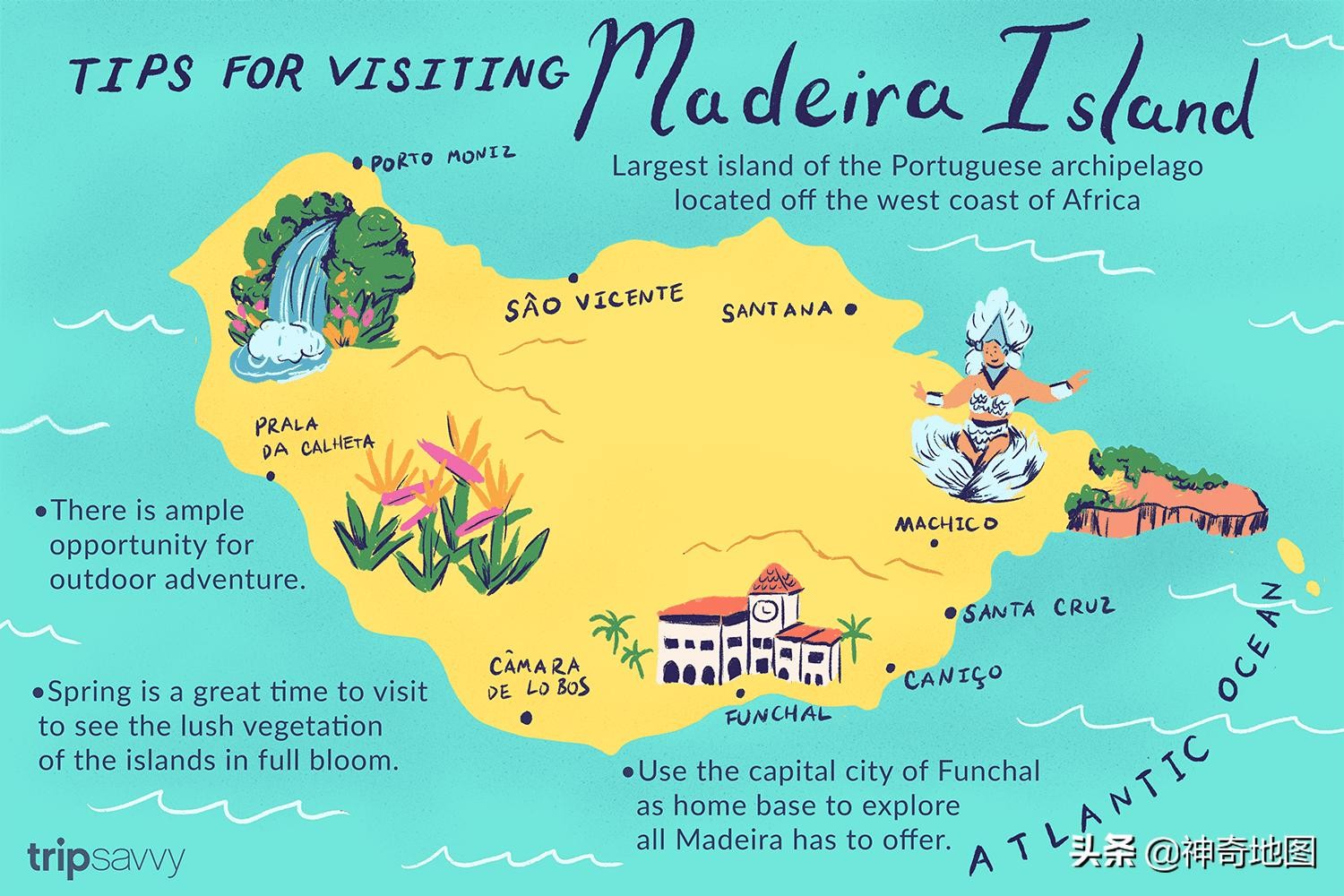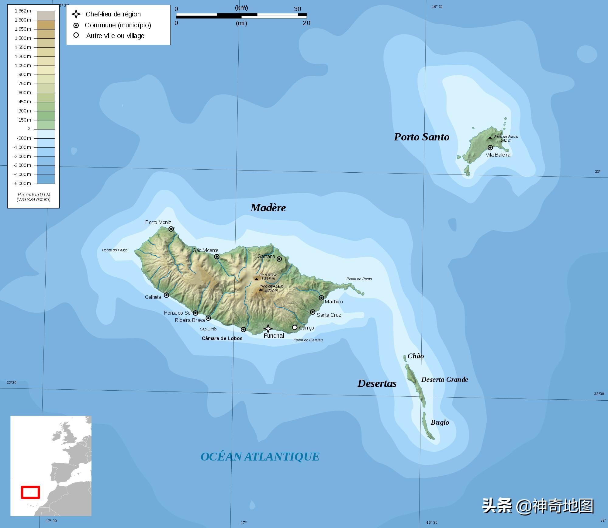 马德拉群岛(Arquipelago da Madeira)是葡萄牙的一个海外自治区,位于非洲摩洛哥外海600公里处,在前面我讲到的西班牙加那利群岛正北方约400公里。与加那利群岛一样,马德拉群岛也是火山岛,主要由主岛马德拉岛(Madeira)、圣港岛(Puerto Santo)与附近若干无人小岛组成。面积794平方公里,人口约30万。面积跟舟山群岛差不多大小,但人口就只有约1/5。