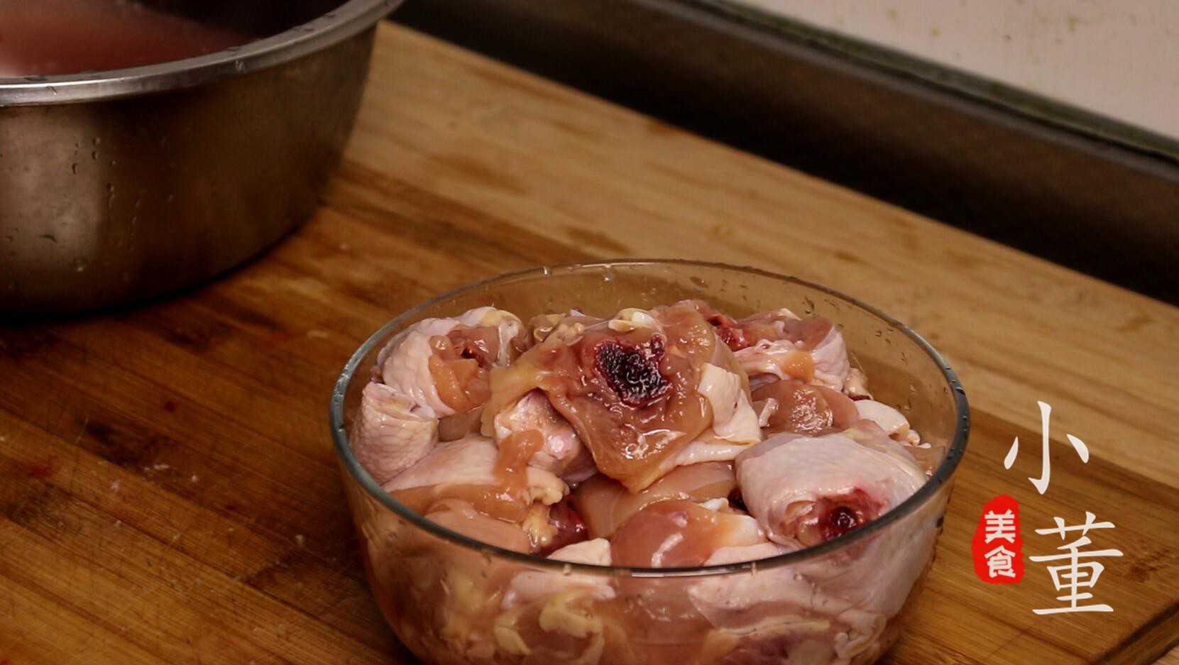 1、处理鸡肉:这是小董在超市买的四个鸡腿,清洗干净,然后给它剁成块,将鸡块放入盆中,加入清水洗一下,洗去血水,捞出来给它在洗一遍