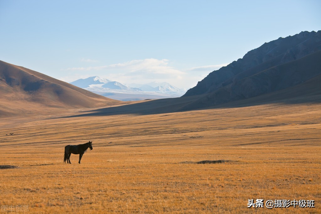 类似的案例,下图(图七),秋天的草原,风景不错。但是左下角的一匹马作为趣味点,形态单调得像是标本。假如,这里有两匹马相互交流,或者有几匹马分散着低头吃草,效果会更美观一些。