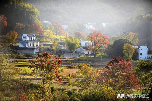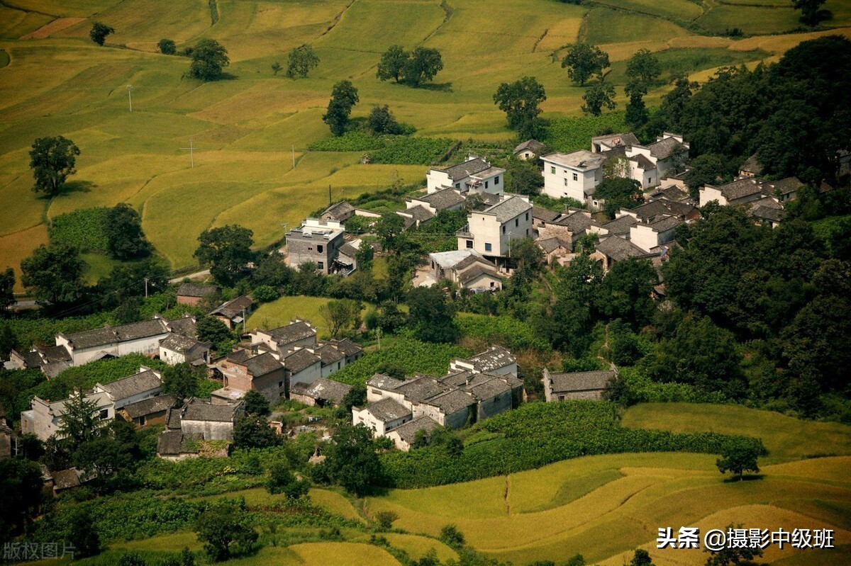 相对来说,下图(图四),拍得是类似的场景,但房屋比较紧凑,是一个相对完整的视觉中心。绿树点缀期间,不但不显杂乱,还丰富了画面。