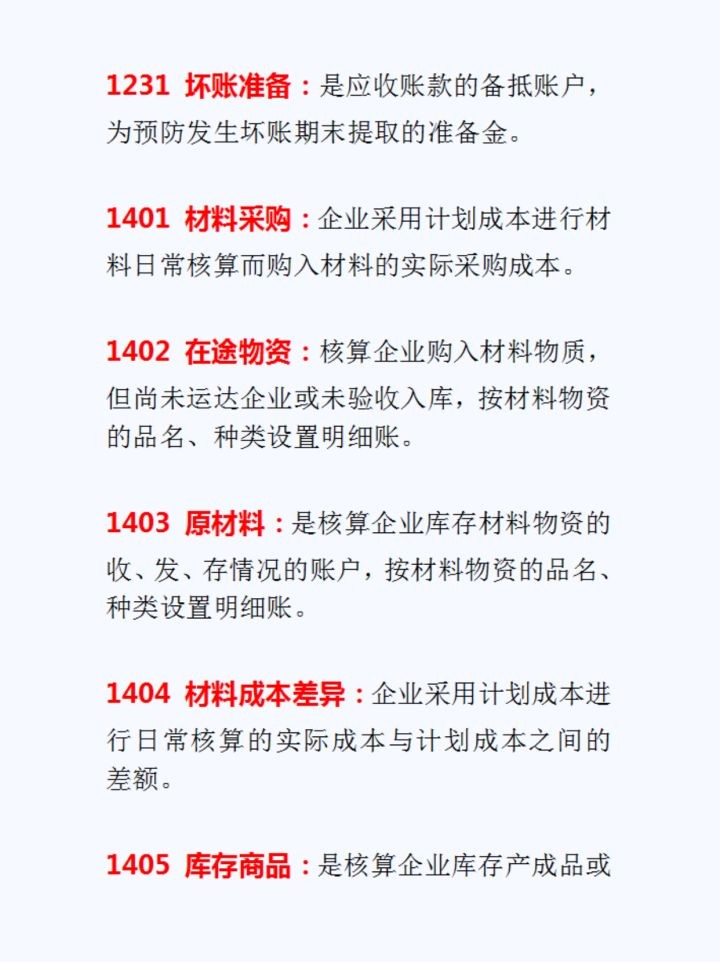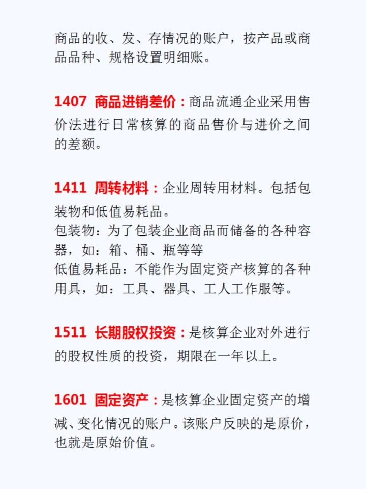 篇幅有限,就不一一展示了。会计工作中常用的会计科目有很多,但是也不是每一个会计科目都需要理解记忆的,我们只用记住我们经常用的会计科目就够了。