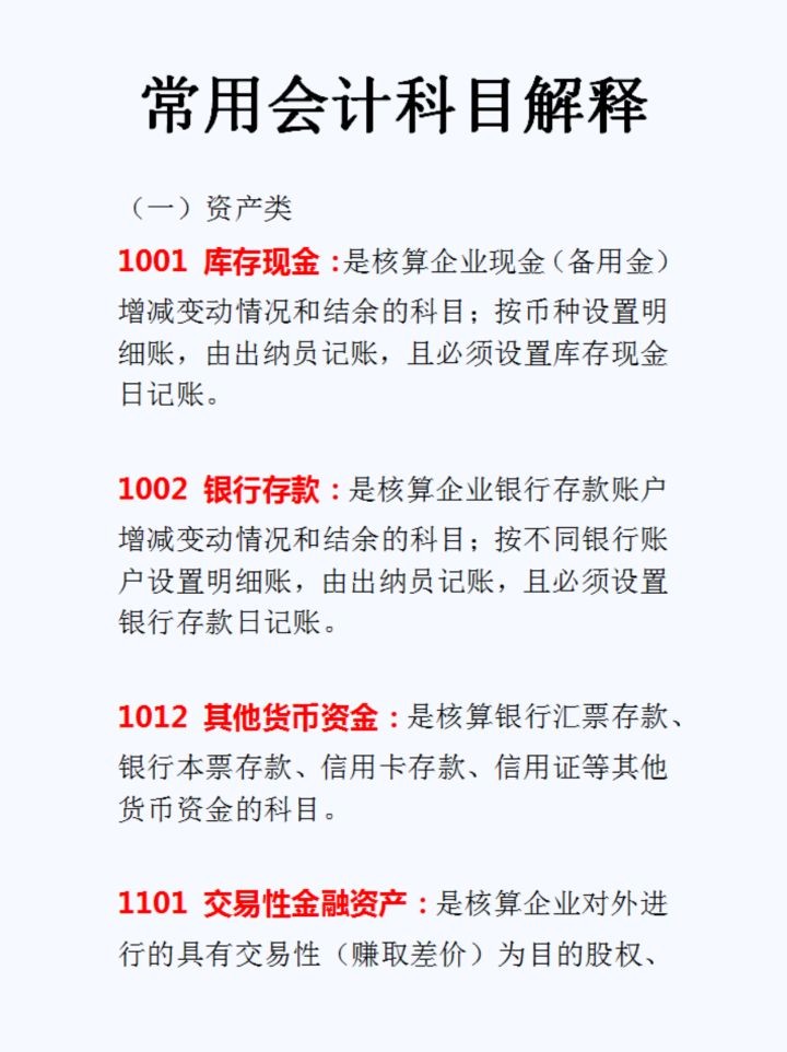 今天我把财务常用的会计科目表、会计科目的大白话解释大全、会计科目的账务处理都给整理好了。以下是部分展示: