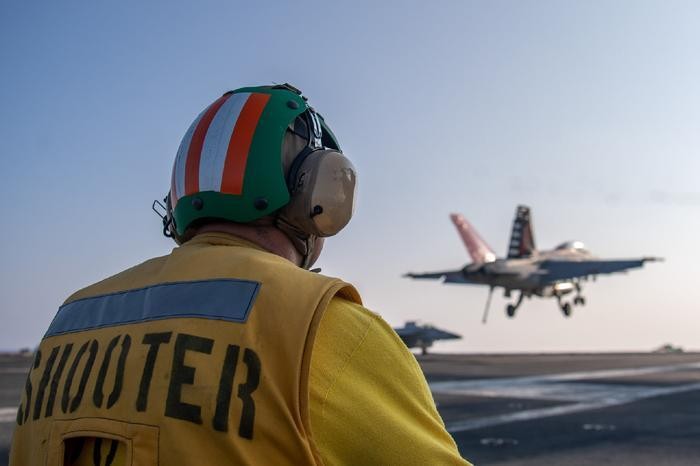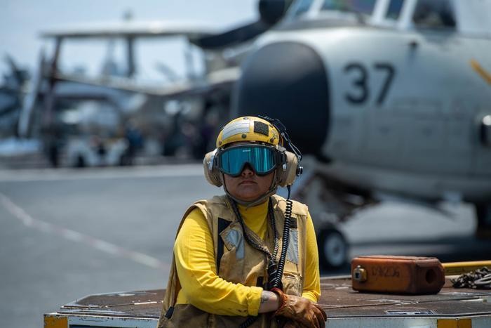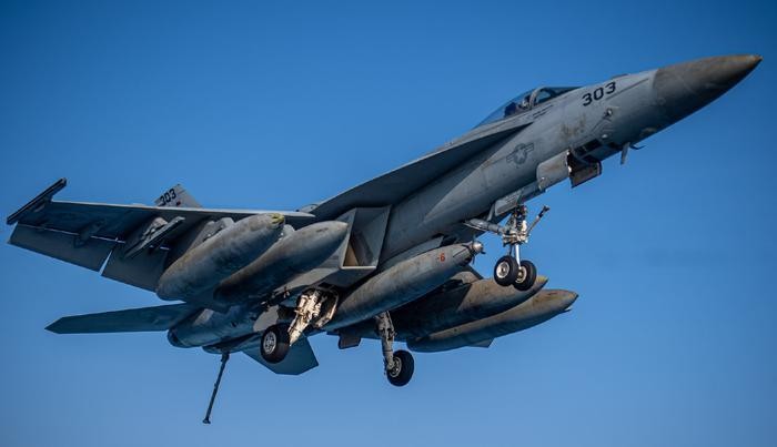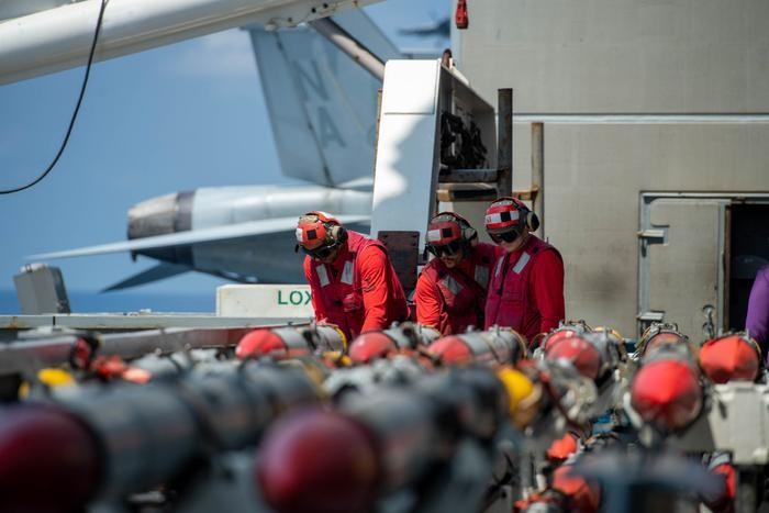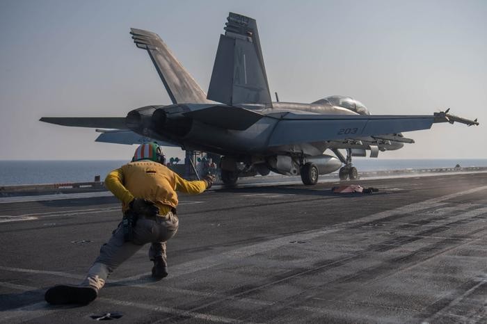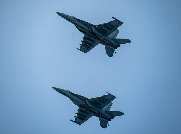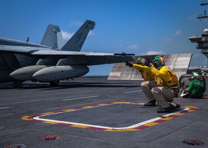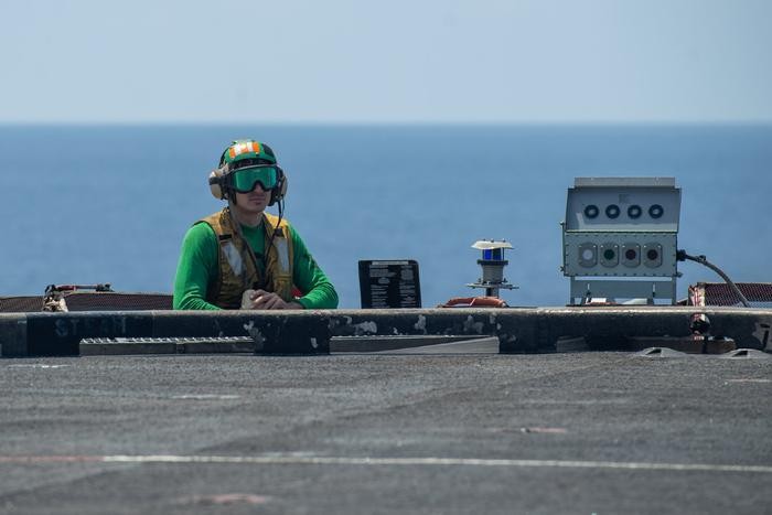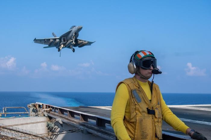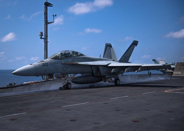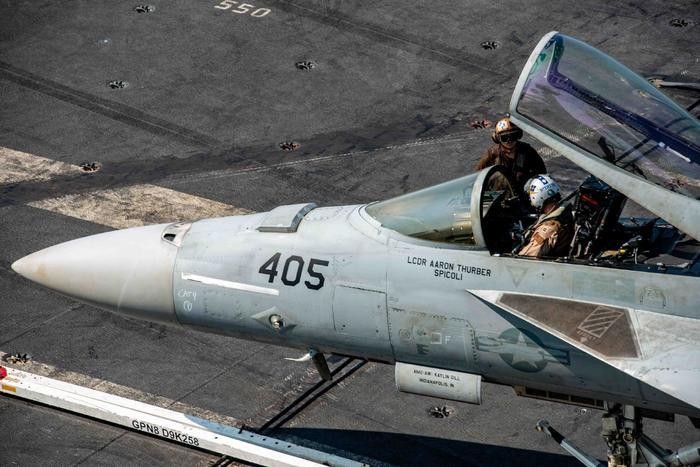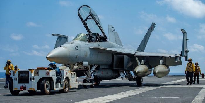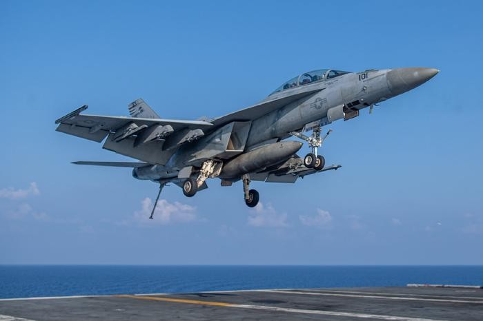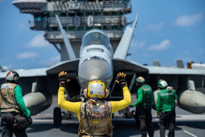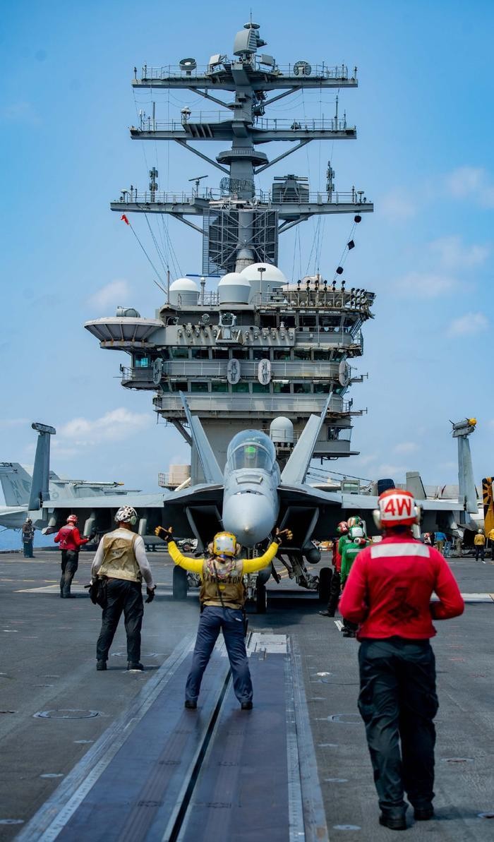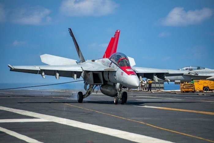 南中国海(2025年4月21日)攻击战斗机中队(VFA) 137“红隼”的一架F/A-18E超级大黄蜂在尼米兹号航空母舰(CVN 68)的飞行甲板上滑行。尼米兹号在美国第七舰队执行例行任务。第七舰队是美国海军最大的前沿部署舰队,定期与盟友和合作伙伴进行互动和行动,以维护印度太平洋地区的自由和开放。