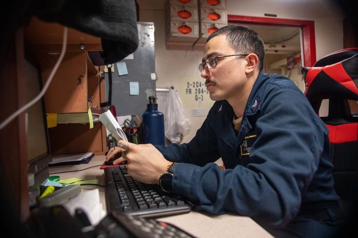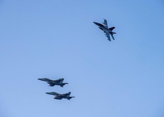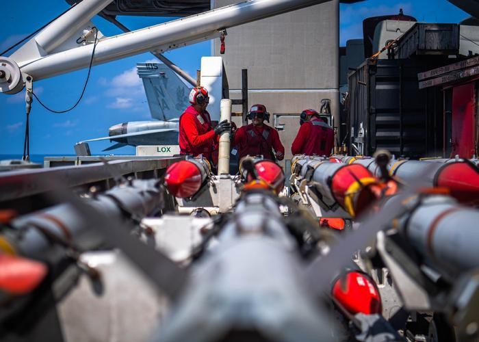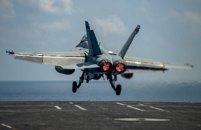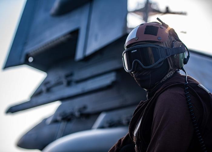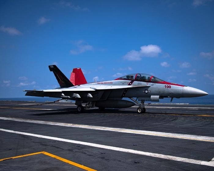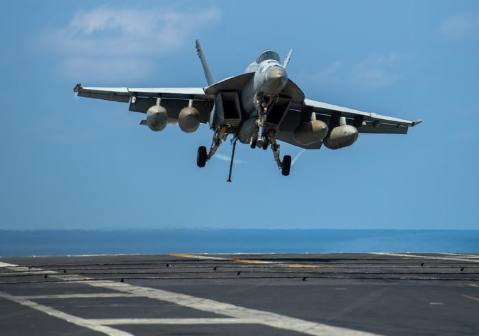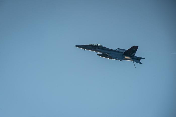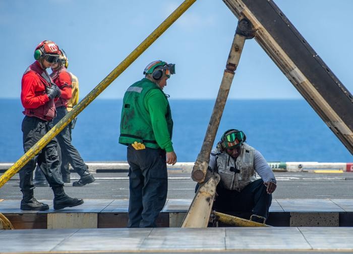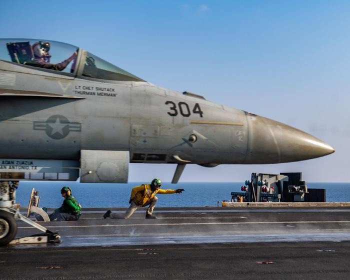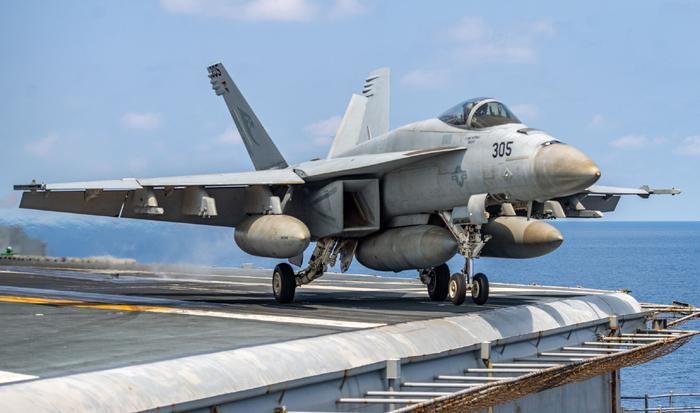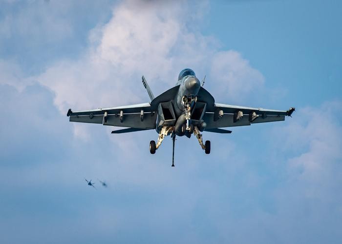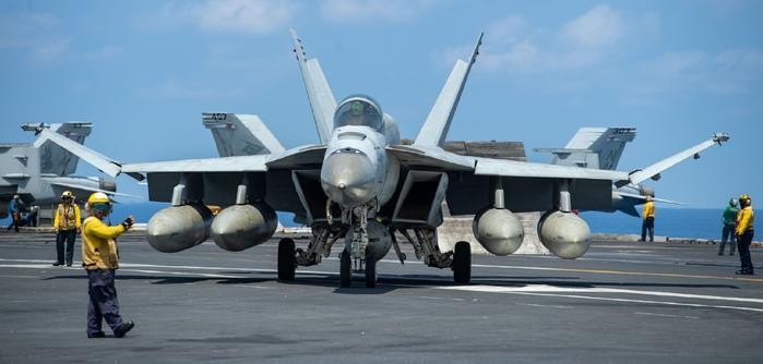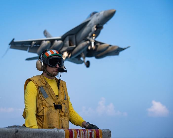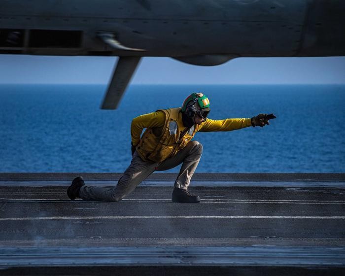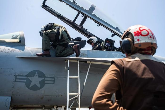 南中国海(2025年4月21日)攻击战斗机中队(VFA) 137“红隼”的一架F/A-18E超级大黄蜂在尼米兹号航空母舰(CVN 68)的飞行甲板上滑行。尼米兹号在美国第七舰队执行例行任务。第七舰队是美国海军最大的前沿部署舰队,定期与盟友和合作伙伴进行互动和行动,以维护印度太平洋地区的自由和开放。
