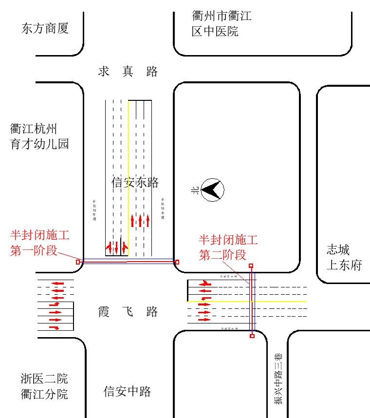 第一阶段:霞飞路与信安东路交接处东侧人行横道(由北向南)采用半封闭交叉施工,过往行人车辆应自觉遵守交通法规,根据交通指示、指挥观察减速慢行(4月7日—4月18日)。