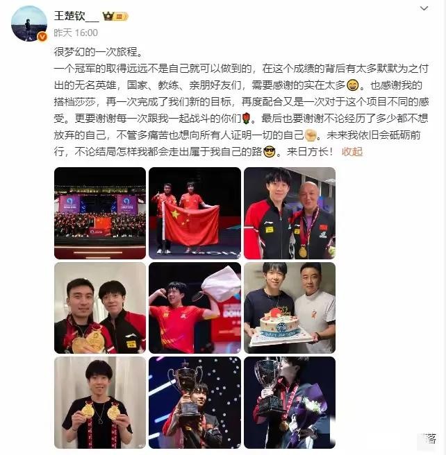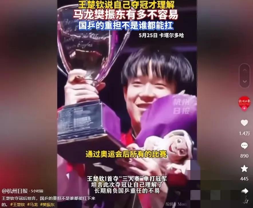 这边樊振东还没正式回归,那边王楚钦就先“放大招”了。5月25号晚的多哈世乒赛男单决赛,他4比1干脆利落地打败巴西名将雨果,直接解锁个人三大赛单打首冠成就,彻底打破“大赛软脚虾”的质疑。这场胜利有多牛?不仅延续了国乒在世乒赛男单11连冠的神话,还让王楚钦完成从潜力新星到世界冠军的蜕变。赛后他发朋友圈感慨:“这一路跟做梦似的……再难也要证明自己!”采访时还特意提到樊振东:“年纪越大越明白,以前龙哥、东哥扛着队伍有多不容易。”这话里话外,满是对前辈的敬意,也透着自己扛起责任的决心。