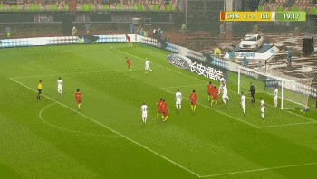 国足角球攻势,蔡慧康跃起头球攻门,被冰岛球员门线解围。