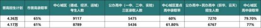 中心城区 (德城、经济、运河) 共有 9117 人参加中考,辖区内德州一中、德州二中、 德州实验中学、跃华学校、 云天学校 5 所学校共投放计划 7270 个 , 预计录取率约为 79.74%。其中 ,德州一中、德州二中、德州实验中学 3 所市属高中投放计划 5470 人,录取 5475 人 ,录取率为 60%。