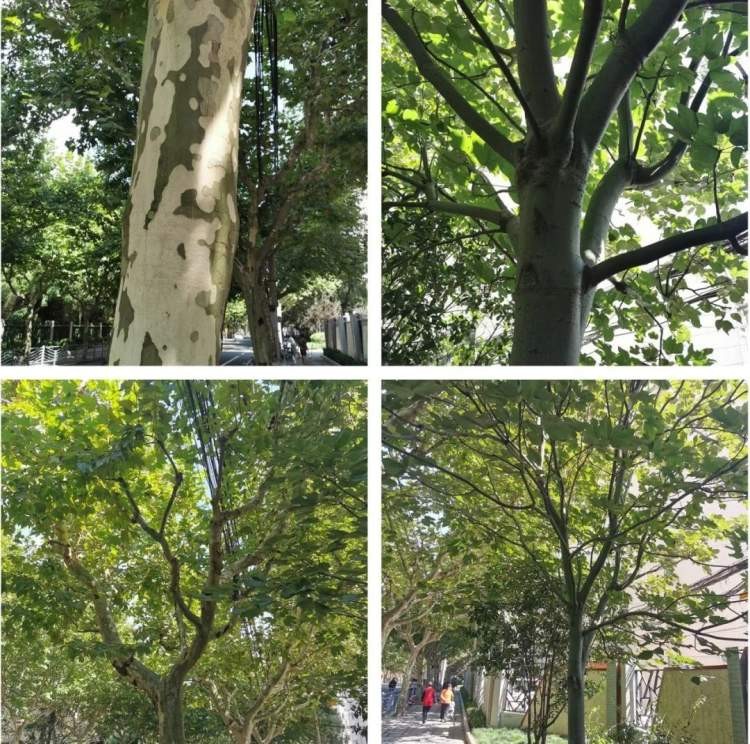 ■悬铃木的树干(左上)和树冠(左下)VS梧桐的树干(右上)和树冠(右下)/上海市绿化和市容管理局提供