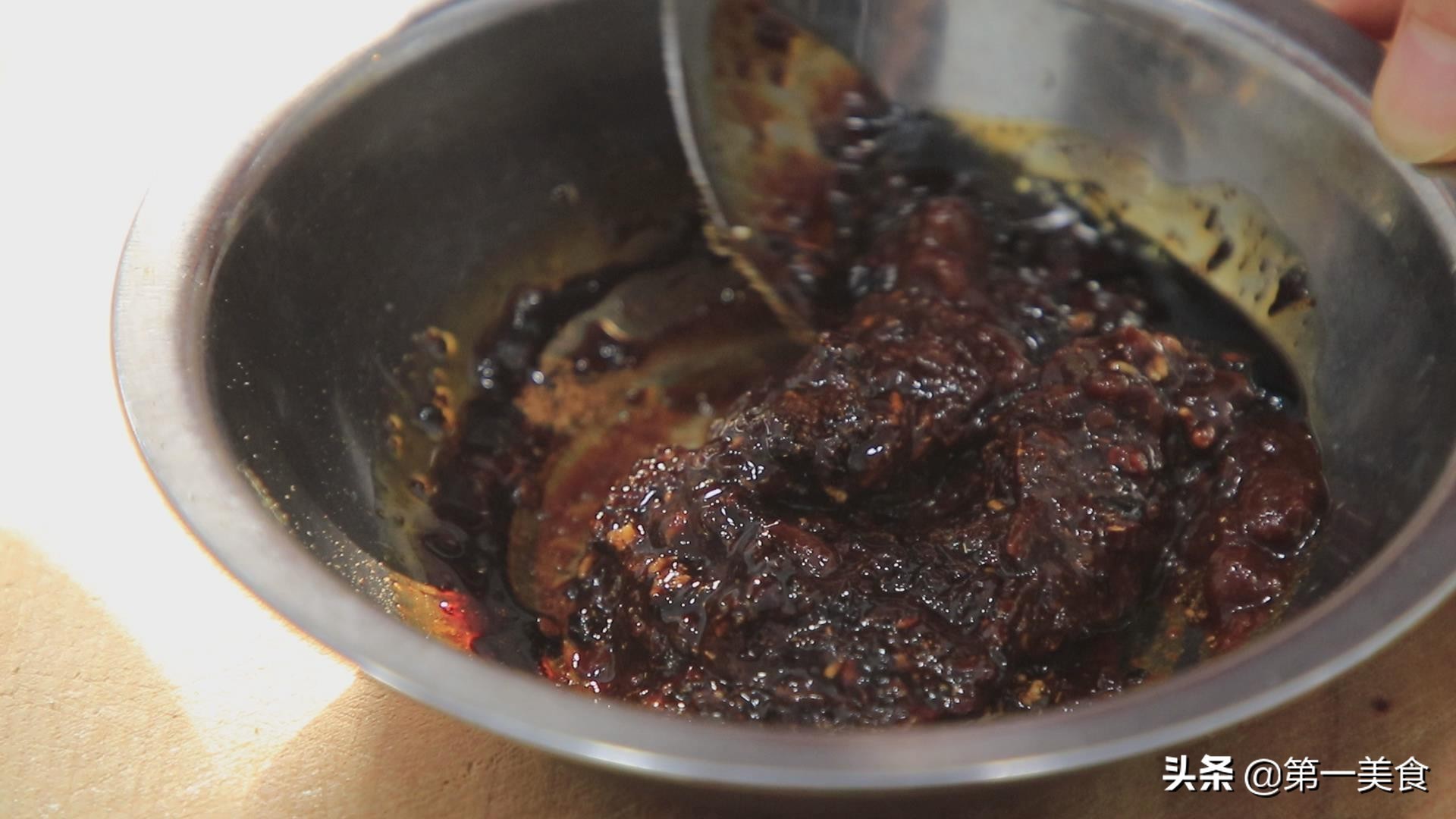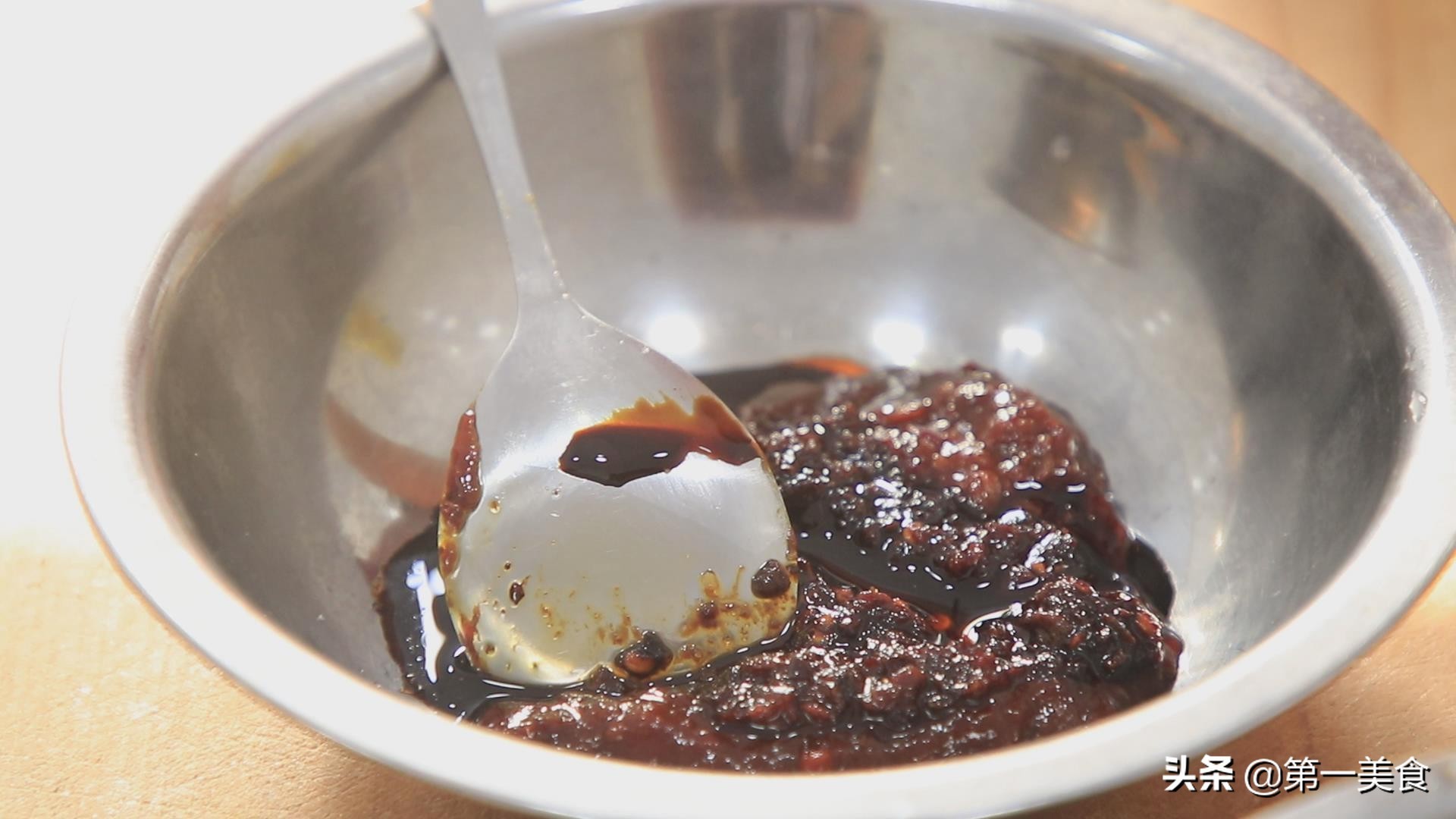 准备一个小盆,加入两勺黄豆酱,一勺豆瓣酱。