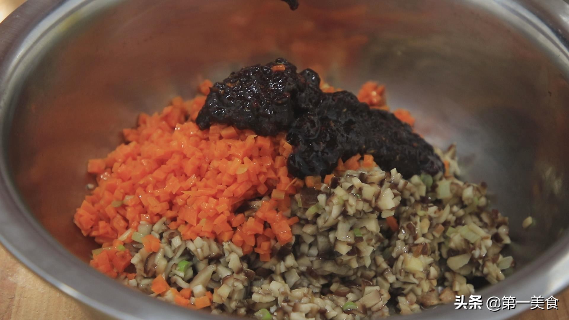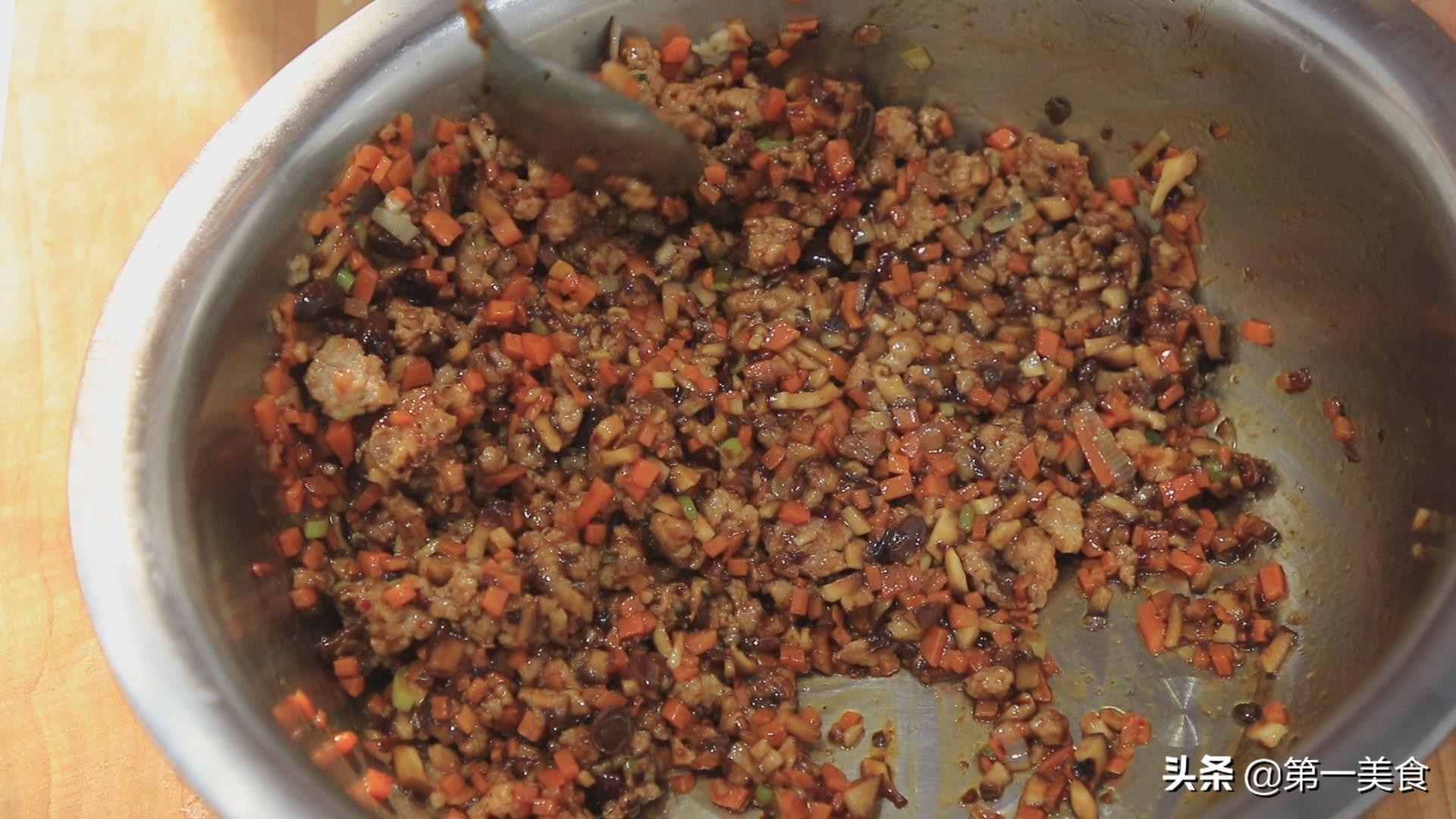 接下来把炒好的肉末、香菇粒、胡萝卜倒在一个盆中。
