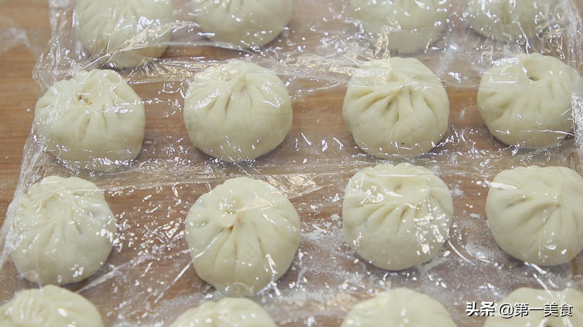 按着这个方法,把全部的馅料,饼皮包完以后,盖上保鲜膜再次发酵10分钟(盖上保鲜膜进行二次发酵,一般10分钟就可以了,发酵的时候,一定要盖好,免的被风吹干) 。