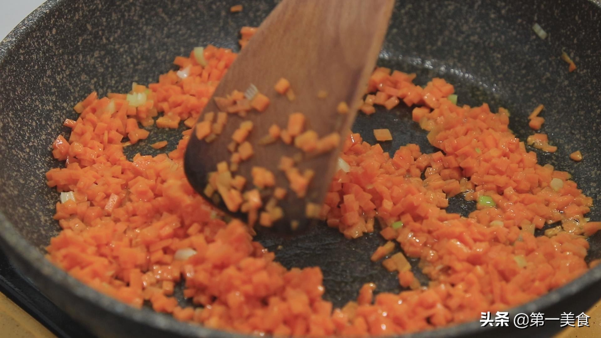 锅内烧少许油,油热以后,放入葱花炸一下。随后放入胡萝卜粒炒至胡萝卜粒断生,倒在盆中备用。