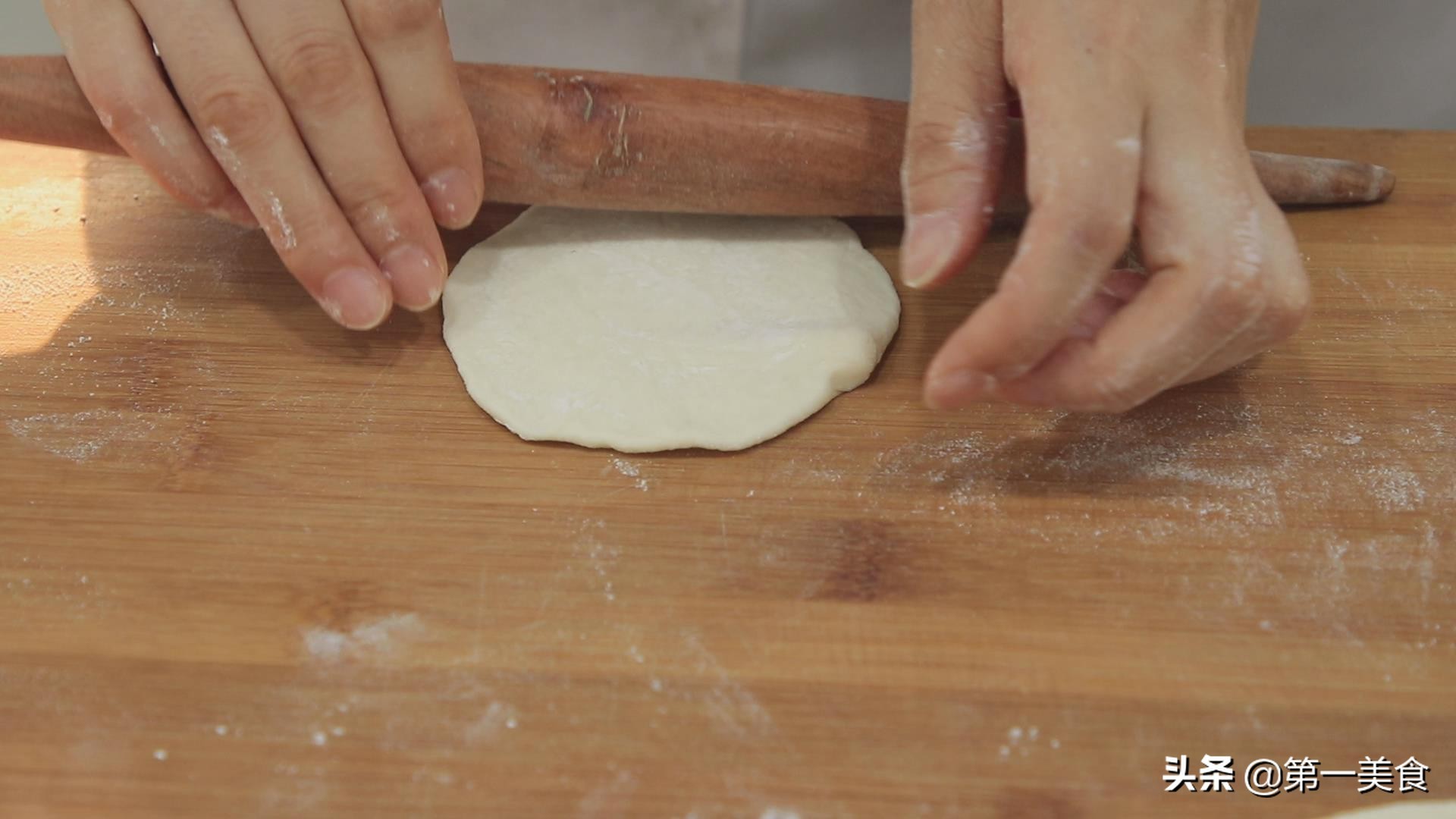 用擀面杖擀成一个稍厚点的圆饼。