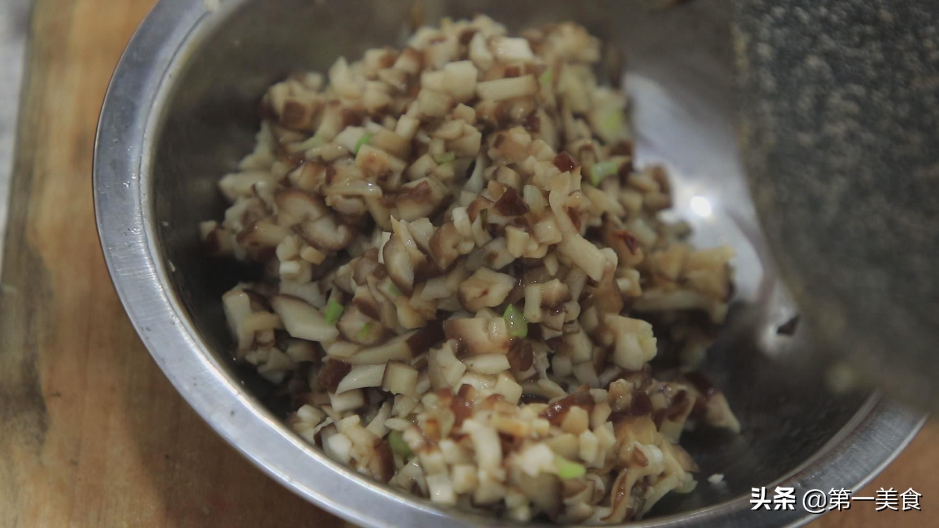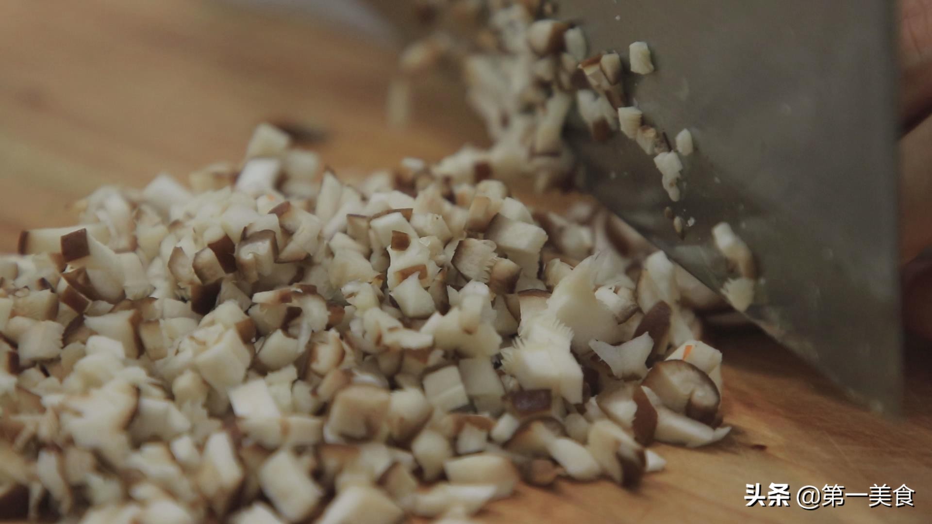 香菇先切成丝,再改刀切成粒。